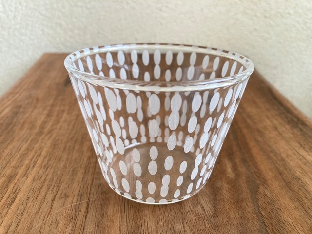 富山で制作するワタナベサラさん。 色の入ったガラスで吹いたベースにポップな絵柄のマスキングをし、サンドブラストで仕上げ。 シンプルなカタチで使いやすく、絵柄が透明で浮き出るのが楽しいです。 径:6.7cm、高さ:6cm #galleryten#ギャラリーテン#ワタナベサラ#ガラス#glass#器