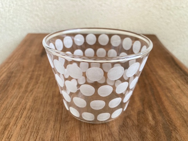 富山で制作するワタナベサラさん。 色の入ったガラスで吹いたベースにポップな絵柄のマスキングをし、サンドブラストで仕上げ。 シンプルなカタチで使いやすく、絵柄が透明で浮き出るのが楽しいです。 径:7cm、高さ:8.8cm #galleryten#ギャラリーテン#ワタナベサラ#ガラス#glass#器
