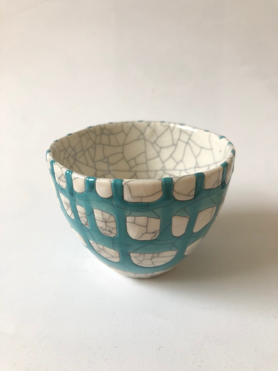 磁土と釉薬の収縮率の違いによってできる貫入(ヒビ)に、墨を入れ、ブルーやピンクなどのラインがモダン。