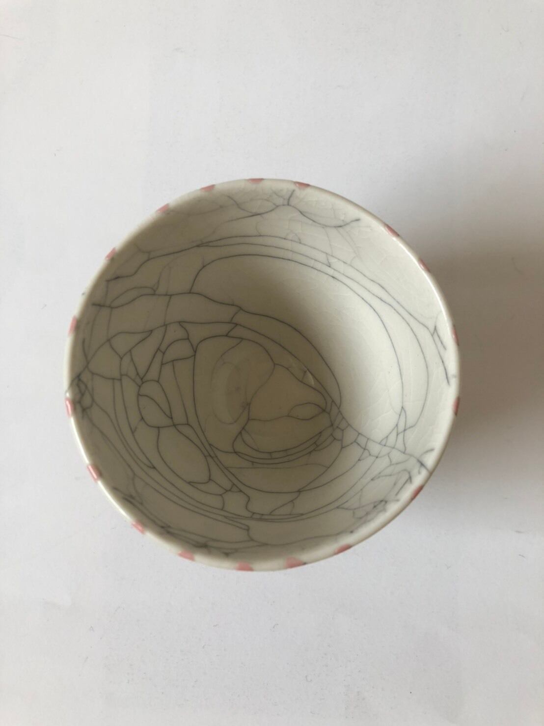 磁土と釉薬の収縮率の違いによってできる貫入(ヒビ)に、墨を入れ、ブルーやピンクなどのラインがモダン。