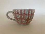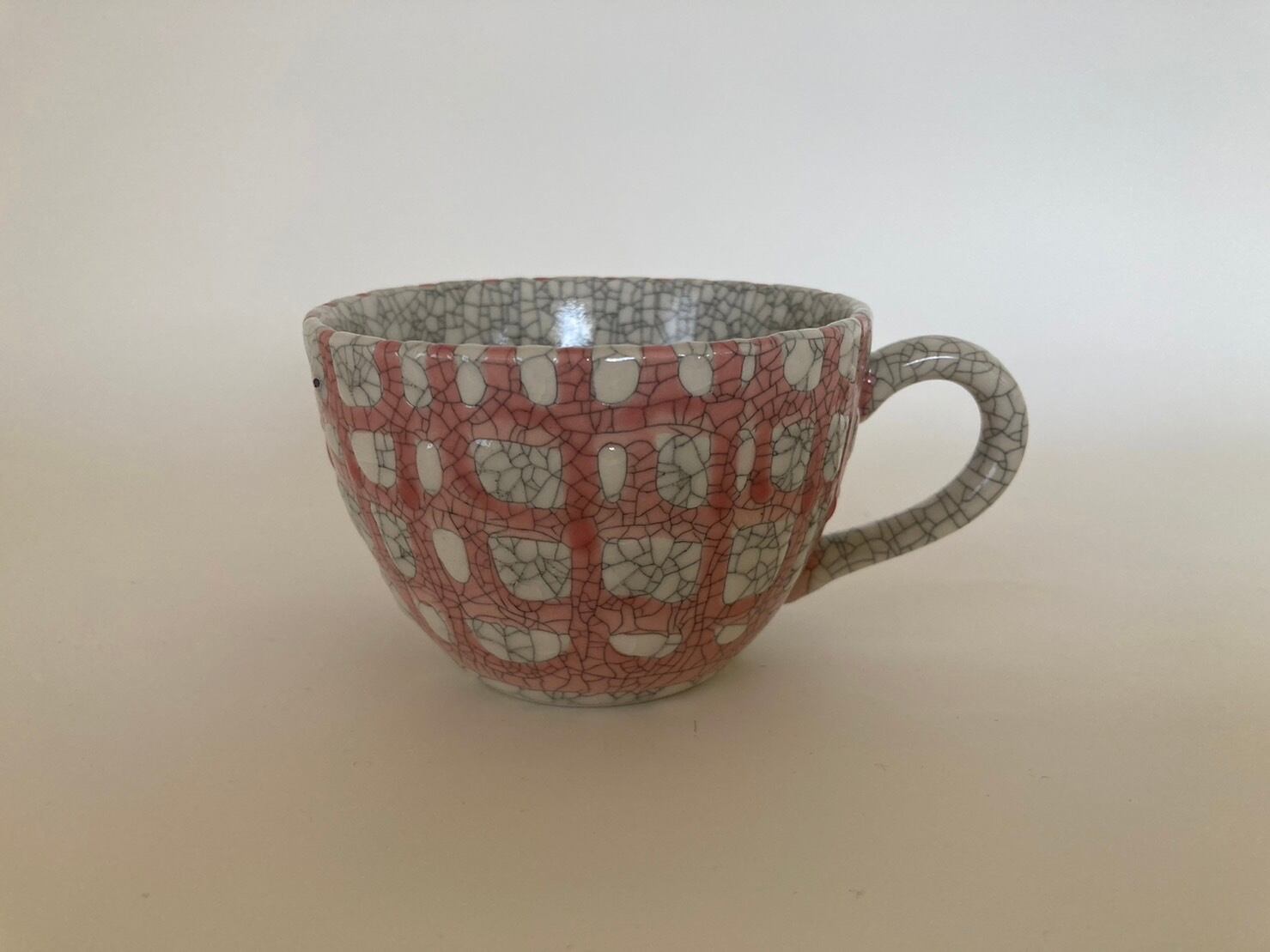 磁土と釉薬の収縮率の違いによってできる貫入(ヒビ)に、墨を入れ、ブルーやピンクなどのラインがモダン。